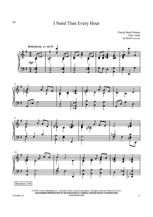 Digital Sheet Music for I Need Thee Every Hour by Robert Lowry, Charity Book Putnam scored for Piano Solo; id:433945