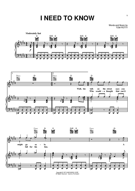 Digital Sheet Music for I Need To Know by Tom Petty scored for Piano/Vocal/Chords; id:367763