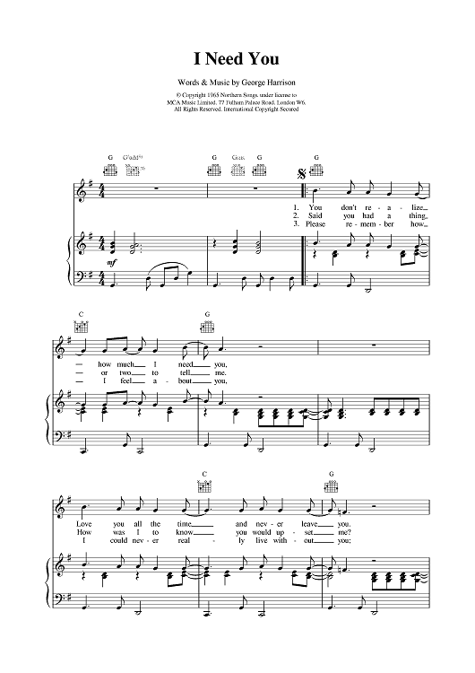 Digital Sheet Music for I Need You by The Beatles, George Harrison scored for Piano/Vocal/Chords; id:377412