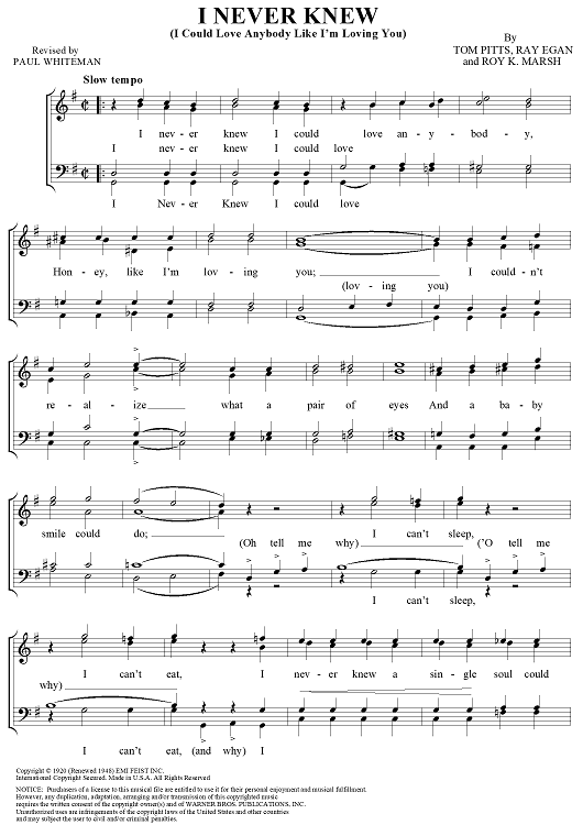 Digital Sheet Music for I Never Knew (I Could Love Anybody Like I'm Loving You) by Roy K. Marsh, Raymond B. Egan, Tom Pitts scored for Barbershop Quartet; id:254779