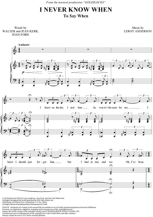 Digital Sheet Music for I Never Know When (To Say When) by Leroy Anderson, Walter Kerr, Jean Kerr, Joan Ford scored for Piano/Vocal; id:313565