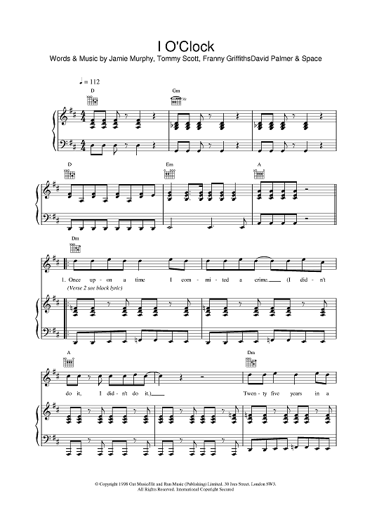 Digital Sheet Music for I O'Clock by Franny Griffiths, Jamie Murphy, Tommy Scott, Space scored for Piano/Vocal/Chords; id:379895