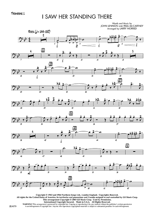 Digital Sheet Music for I Saw Her Standing There - Trombone 1 by Paul McCartney, John Lennon, Larry Norred scored for Jazz Ensemble; id:455784