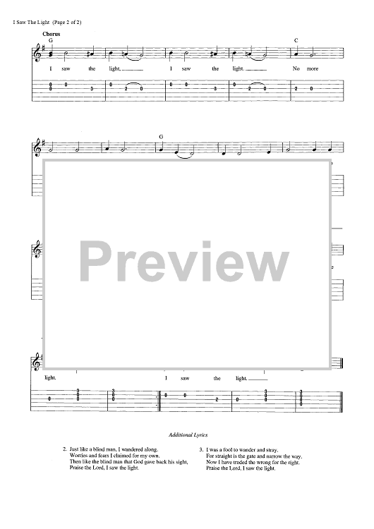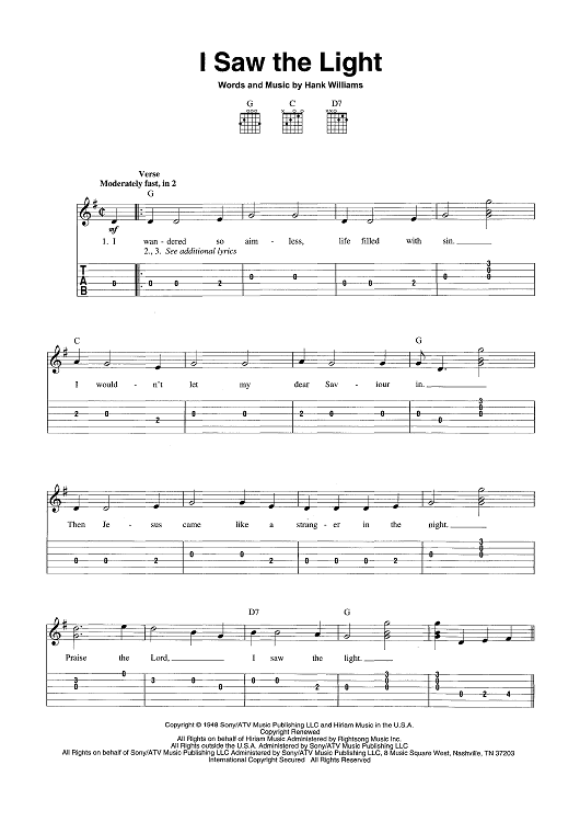 Digital Sheet Music for I Saw the Light by Hank Williams scored for Easy Guitar Tab/Vocal/Chords; id:456735