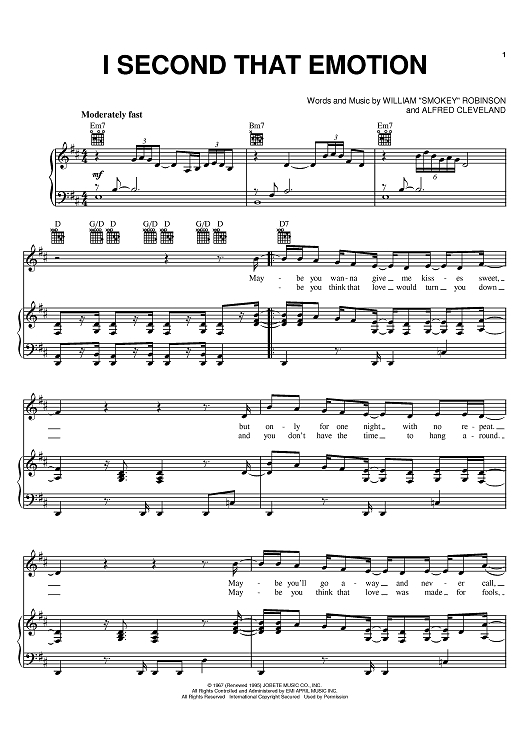 Digital Sheet Music for I Second That Emotion by Michael McDonald, Smokey Robinson, Al Cleveland, The Miracles scored for Piano/Vocal/Chords; id:394881