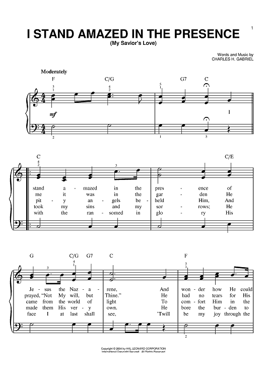 Digital Sheet Music for I Stand Amazed In The Presence (My Savior's Love) by Charles H. Gabriel scored for Easy Piano; id:381095