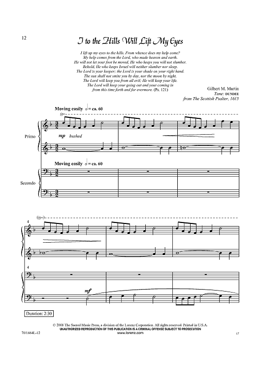 Digital Sheet Music for I to the Hills Will Lift My Eyes by Gilbert M. Martin, Scottish Psalter scored for Piano Duet; id:433972