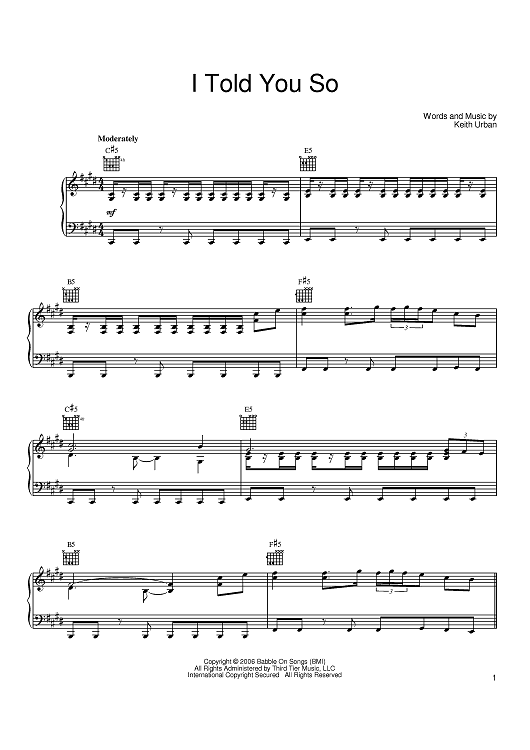 Digital Sheet Music for I Told You So by Keith Urban scored for Piano/Vocal/Chords; id:402461