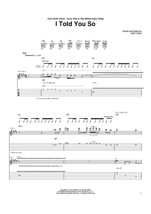 Digital Sheet Music for I Told You So by Keith Urban scored for Guitar Tab; id:402471