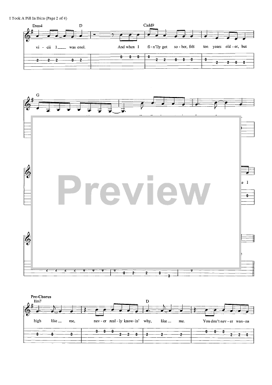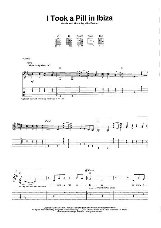 Digital Sheet Music for I Took A Pill In Ibiza by Mike Posner scored for Easy Guitar Tab/Vocal; id:465617