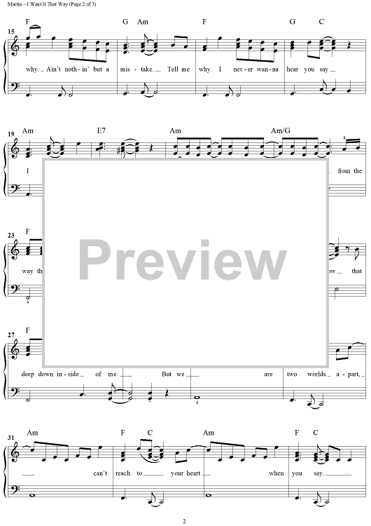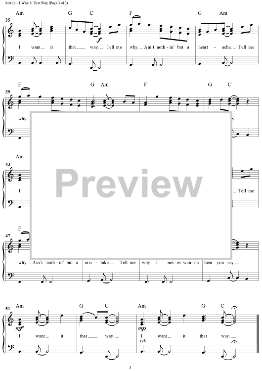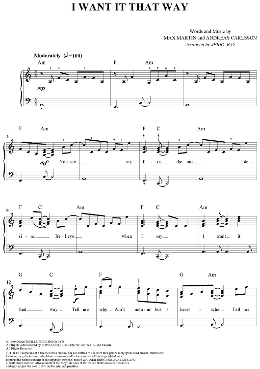 Digital Sheet Music for I Want It That Way by Jerry Ray, Max Martin, Andreas Carlsson scored for Easy Piano/Vocal; id:317640