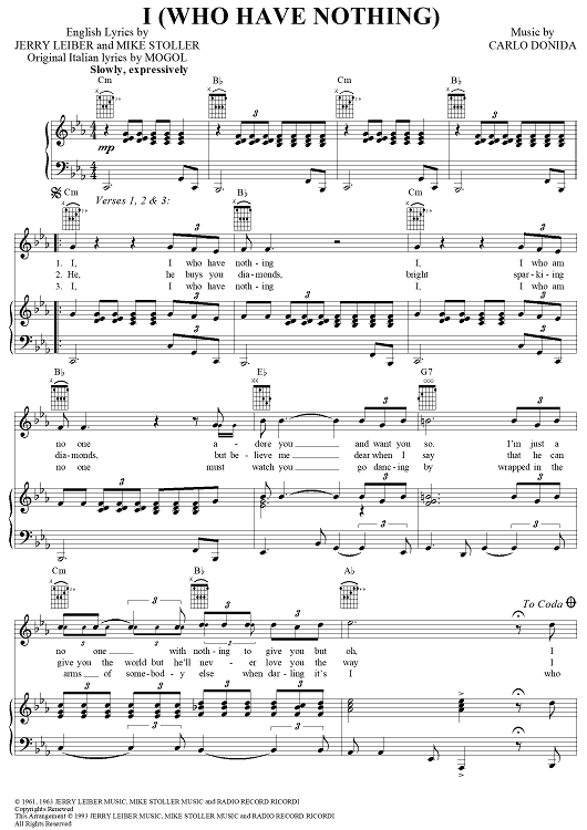 Digital Sheet Music for I (Who Have Nothing) by Jerry Leiber, Mike Stoller, Ben E. King, Carlo Donida, Jordin Sparks, Shirley Bassey scored for Piano/Vocal/Chords; id:271097