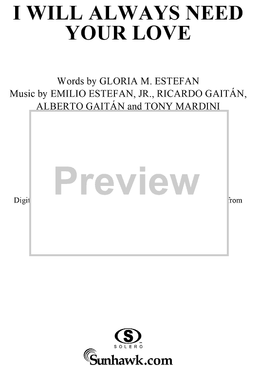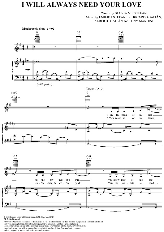 Digital Sheet Music for I Will Always Need Your Love by Gloria Estefan, Emilio Estefan Jr., Alberto Gaitan, Tony Mardini, Ricardo Gaitan scored for Piano/Vocal/Chords; id:305290