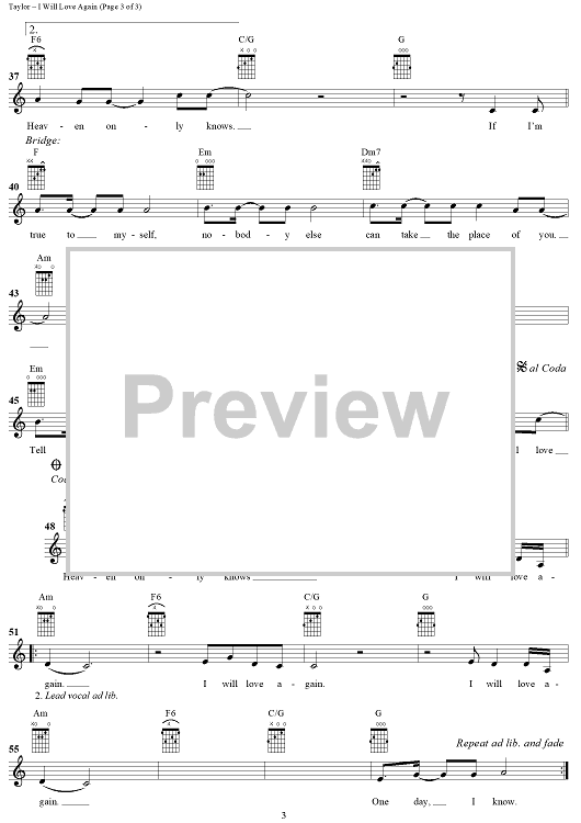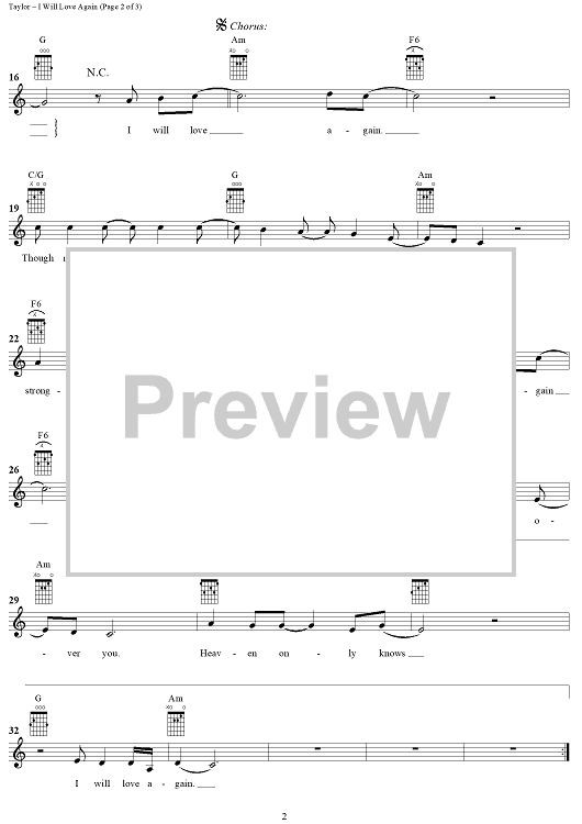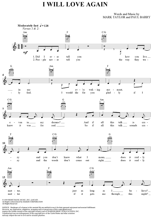 Digital Sheet Music for I Will Love Again by Mark Taylor, Lara Fabian, Paul Barry scored for Easy Guitar/Vocal; id:285754