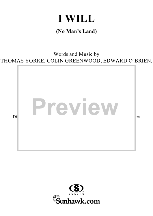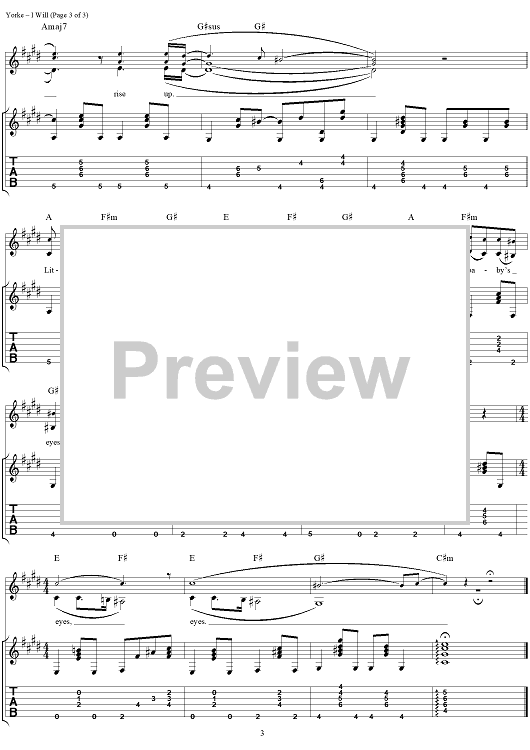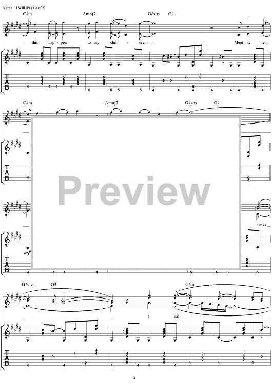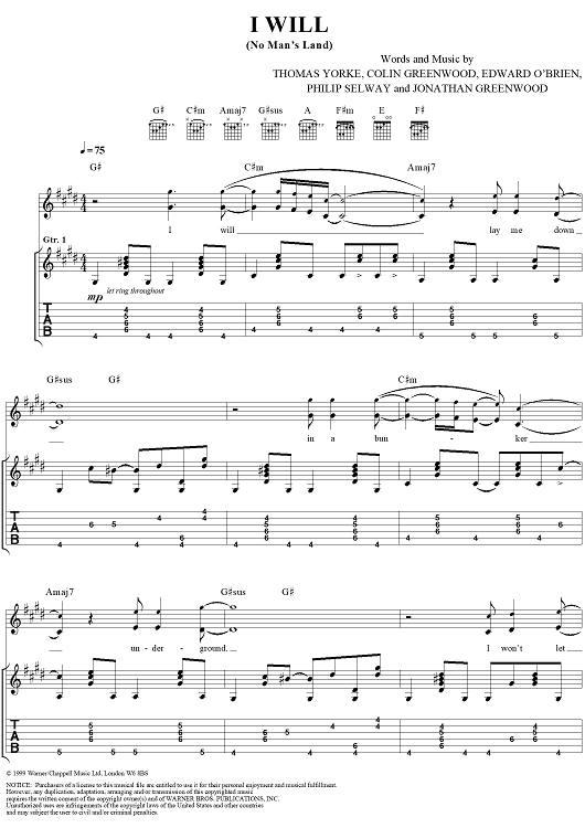 Digital Sheet Music for I Will by Thomas Yorke, Jonathan Greenwood, Philip Selway, Coz, Edward O'Brien, Radiohead scored for Guitar Tab/Vocal; id:297009
