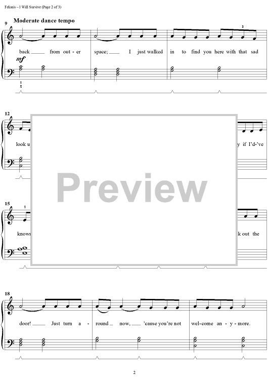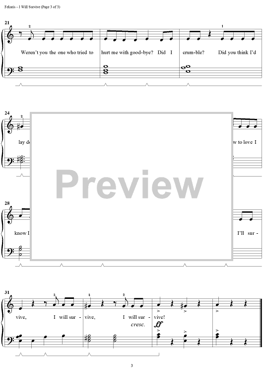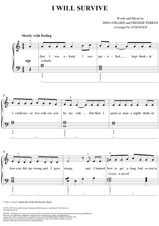 Digital Sheet Music for I Will Survive by Tom Roed, Dino Fekaris, Gloria Gaynor, Freddie Perren scored for Easy Piano/Vocal; id:312430