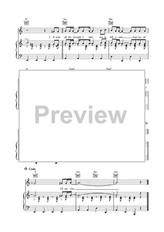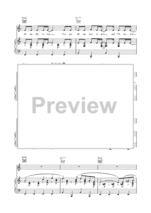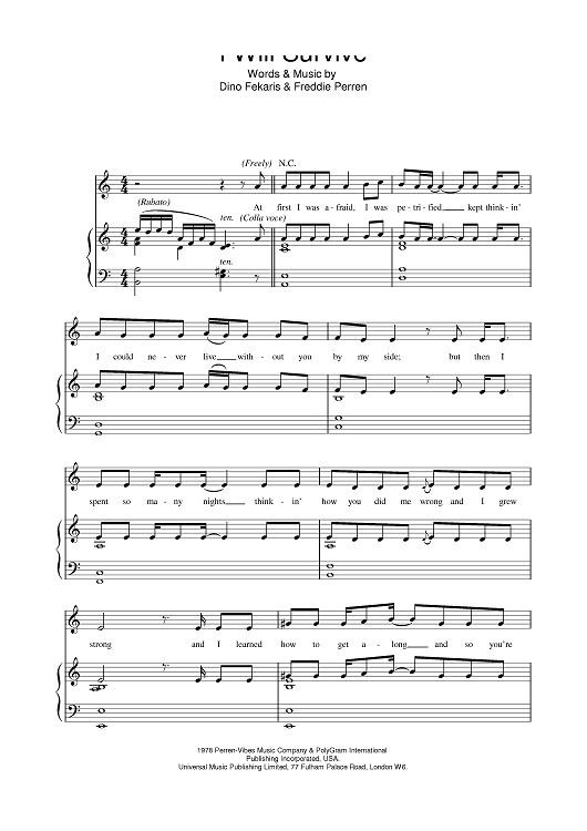 Digital Sheet Music for I Will Survive by Dino Fekaris, Gloria Gaynor, Freddie Perren scored for Piano/Vocal/Chords; id:382436