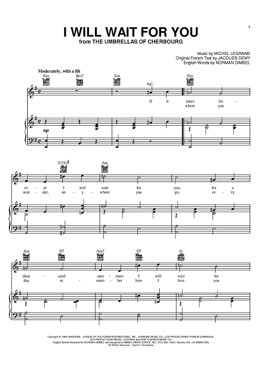 Digital Sheet Music for I Will Wait For You by Frank Sinatra, Andy Williams, Michel LeGrand, Norman Gimbel, Jacques Demy scored for Piano/Vocal/Chords; id:380644