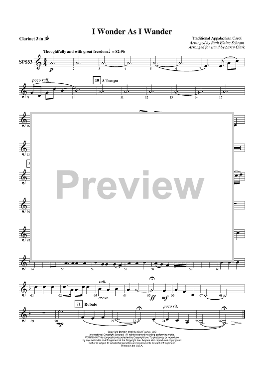 Digital Sheet Music for I Wonder As I Wander - Appalachian Melody - Clarinet 3 in B-flat by Ruth Elaine Schram, Traditional scored for Concert Band; id:409364