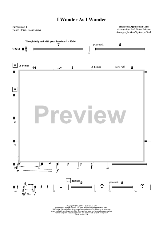 Digital Sheet Music for I Wonder As I Wander - Appalachian Melody - Percussion 1 by Ruth Elaine Schram, Traditional scored for Concert Band; id:409386
