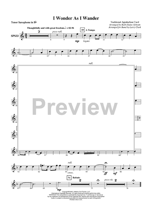 Digital Sheet Music for I Wonder As I Wander - Appalachian Melody - Tenor Sax by Ruth Elaine Schram, Traditional scored for Concert Band; id:409369