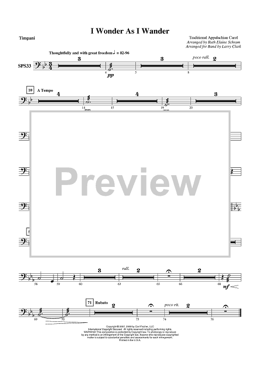 Digital Sheet Music for I Wonder As I Wander - Appalachian Melody - Timpani by Ruth Elaine Schram, Traditional scored for Concert Band; id:409385