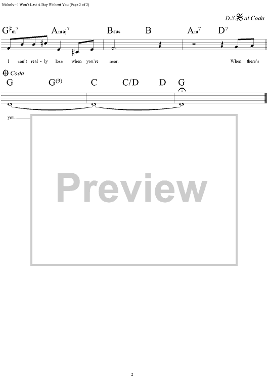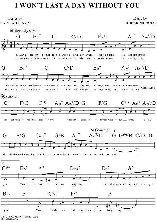 Digital Sheet Music for I Won't Last a Day Without You by Roger Nichols, Karen Carpenter, Paul Williams scored for Lead Sheet; id:112671