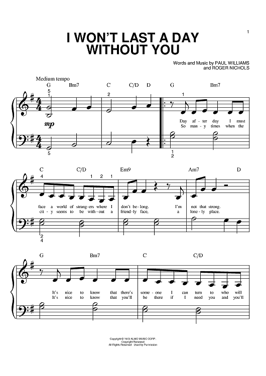 "I Won't Last A Day Without You" Sheet Music by The Carpenters