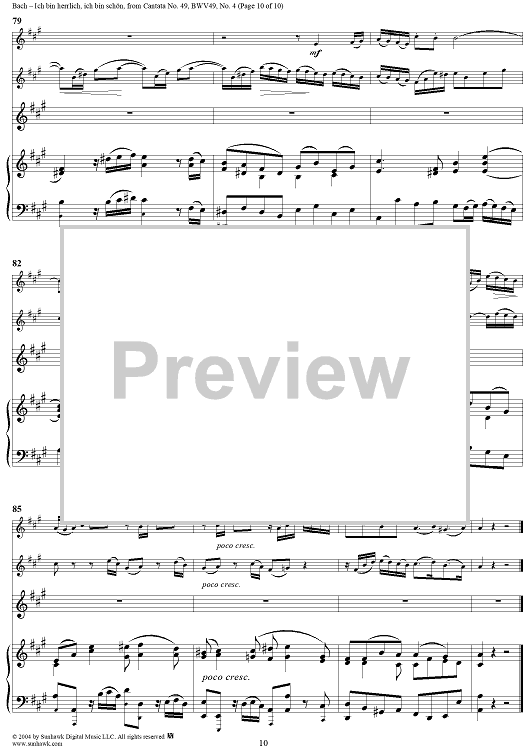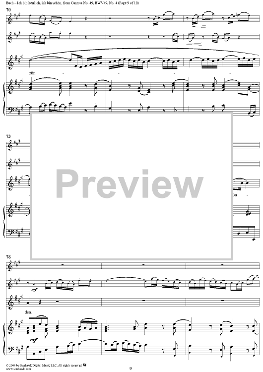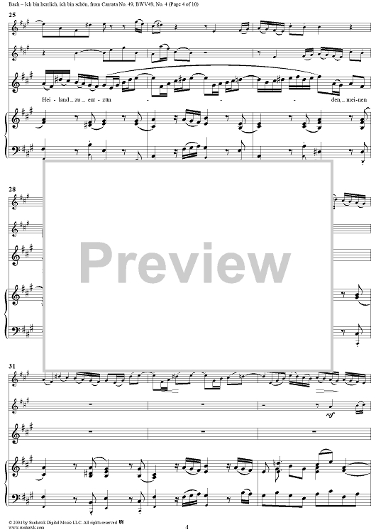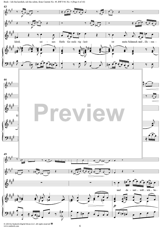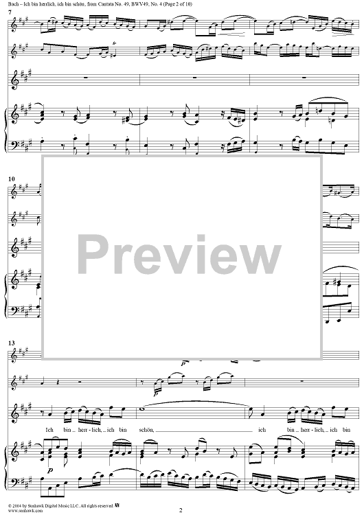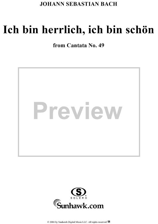 Digital Sheet Music for "Ich bin herrlich, ich bin schön", Aria, No. 4 from Cantata No. 49: "Ich geh' und suche mit Verlangen" - Piano Score by Johann Sebastian Bach scored for Soprano, Oboe d'amore, Cello piccolo and Piano or Organ; id:304037