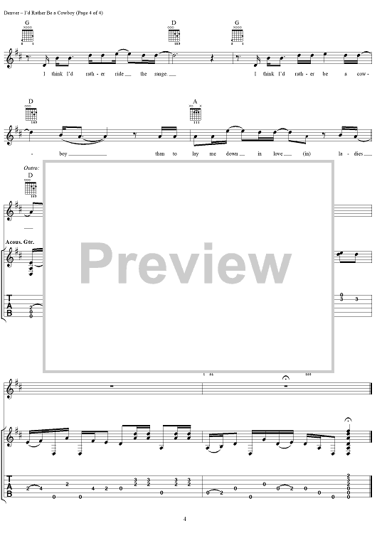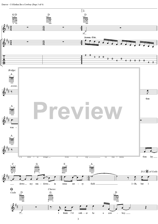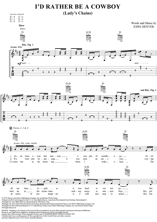 Digital Sheet Music for I'd Rather Be a Cowboy by John Denver scored for Guitar Tab/Vocal; id:287731