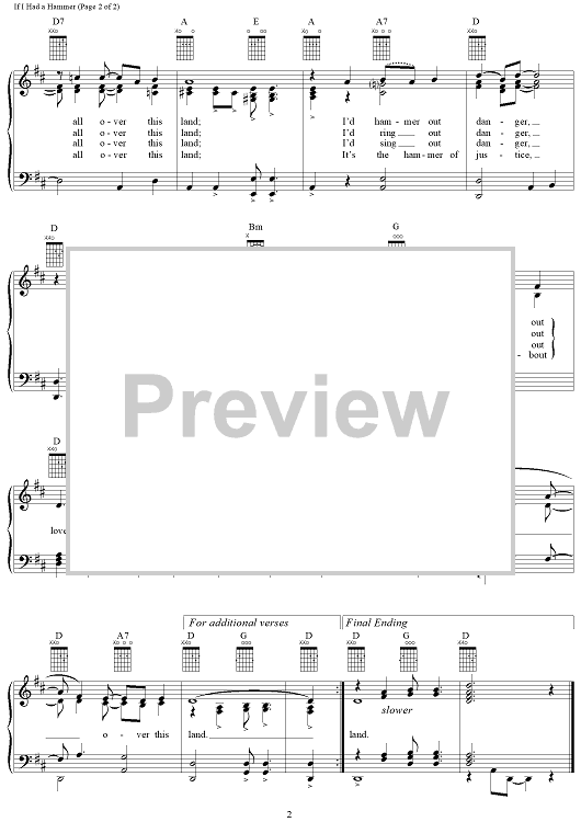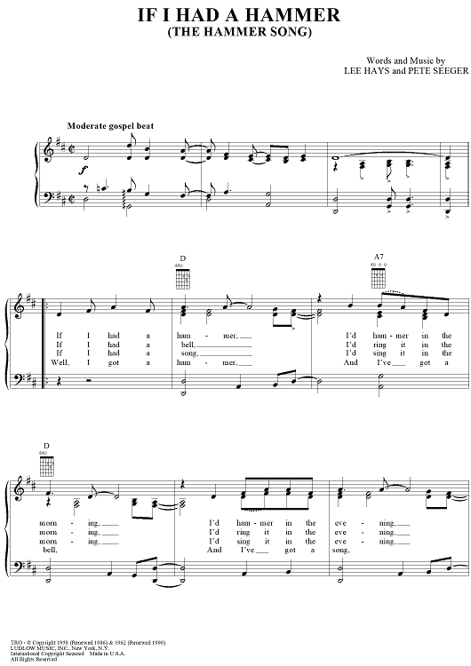 Digital Sheet Music for If I Had a Hammer by The Weavers, Lee Hays, Peter Seeger, Peter, Paul and Mary scored for Piano/Vocal/Chords; id:113659