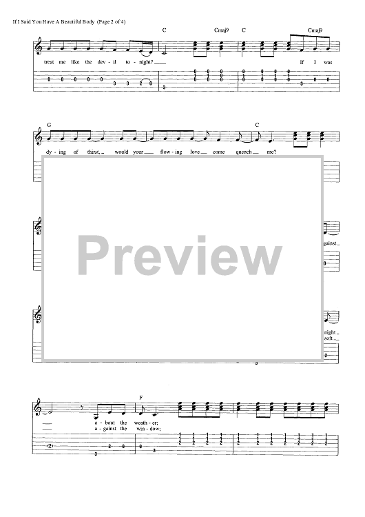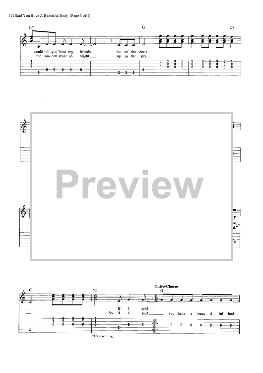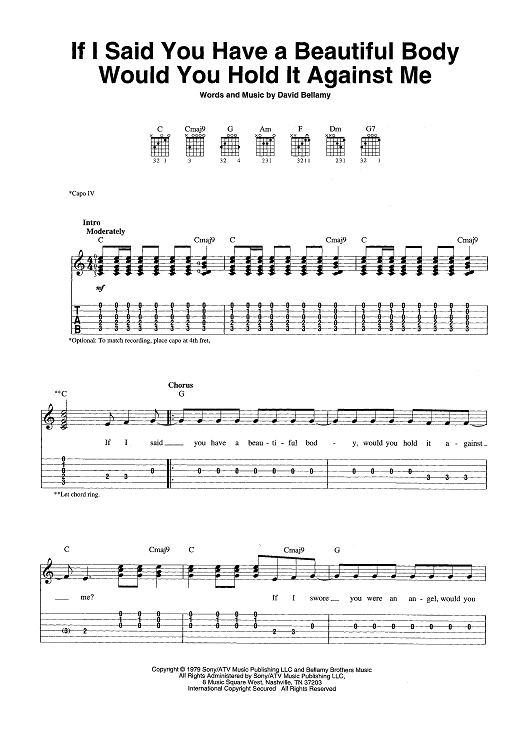 Digital Sheet Music for If I Said You Have a Beautiful Body Would You Hold It Against Me by David Bellamy, Bellamy Brothers scored for Easy Guitar Tab/Vocal/Chords; id:456737