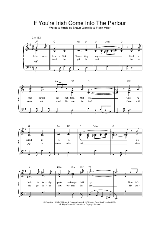 Digital Sheet Music for If You're Irish Come Into The Parlour by S Glenville, Frank Miller scored for Piano/Vocal/Chords; id:379777
