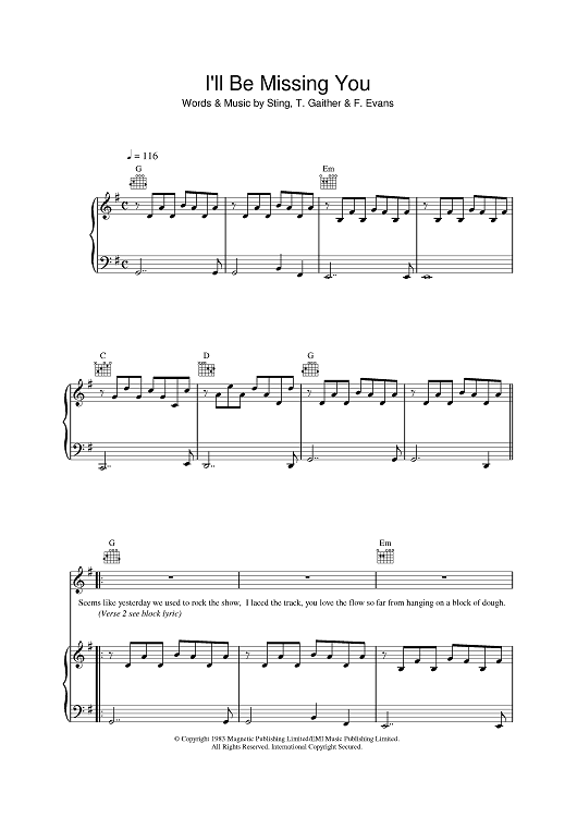 Digital Sheet Music for I'll Be Missing You by Sting, Faith Evans, Diddy scored for Piano/Vocal/Chords; id:398737