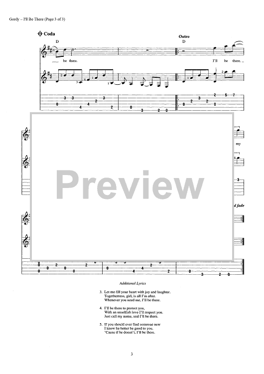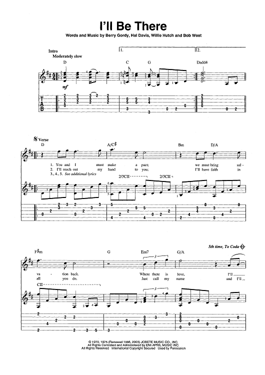 Digital Sheet Music for I'll Be There by Berry Gordy Jr., Willie Hutch, Bob West, Hal Davis scored for Guitar Tab/Vocal/Chords; id:442890