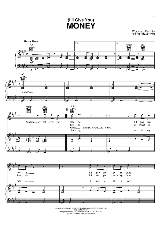 Digital Sheet Music for (I'll Give You) Money by Peter Frampton scored for Piano/Vocal/Chords; id:383790