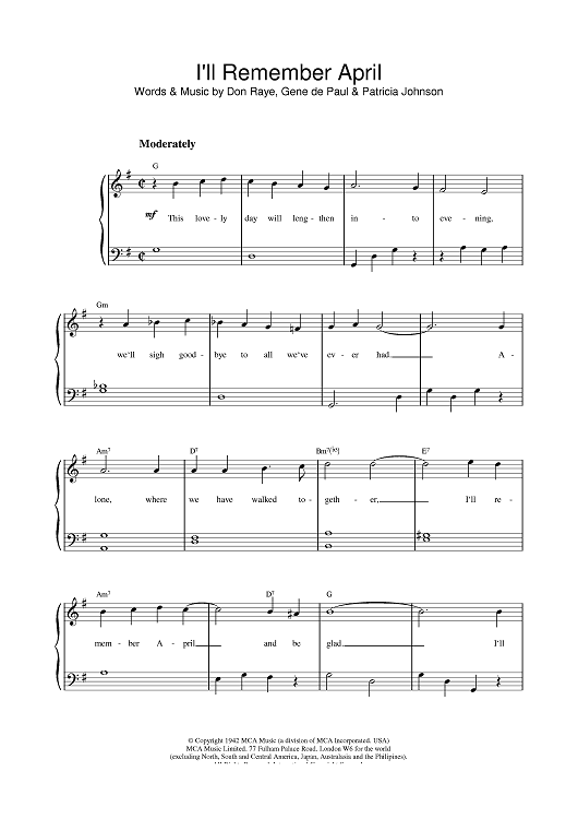 Digital Sheet Music for I'll Remember April by Charlie Parker, Don Raye, Gene De Paul, Lee Konitz, Patricia Johnson scored for Piano; id:380934