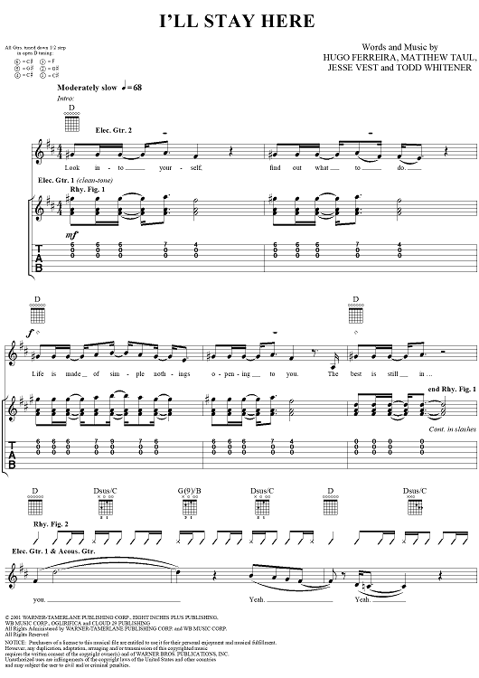 Digital Sheet Music for I'll Stay Here by Todd Whitener, Tantric, Hugo Ferreira, Matthew Taul, Jesse Vest scored for Guitar Tab/Vocal; id:287757