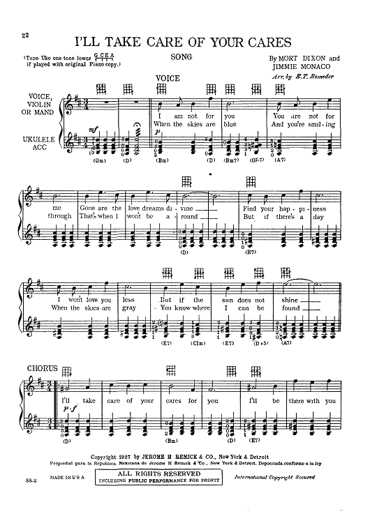 Digital Sheet Music for I'll Take Care of Your Cares by , James V. Monaco, Mort Dixon, E. T. Romeder scored for Ukulele; id:418693