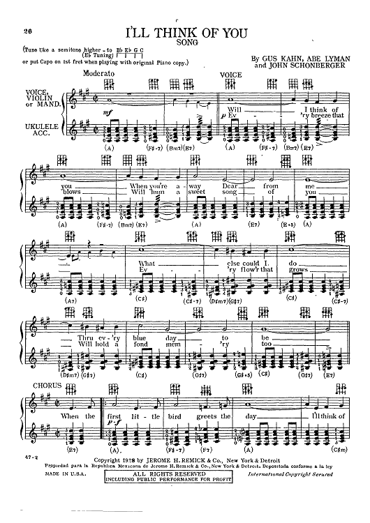Digital Sheet Music for I'll Think Of You by , Gus Kahn, Abe Lyman, John Schonberger, E. T. Romeder scored for Ukulele; id:418743