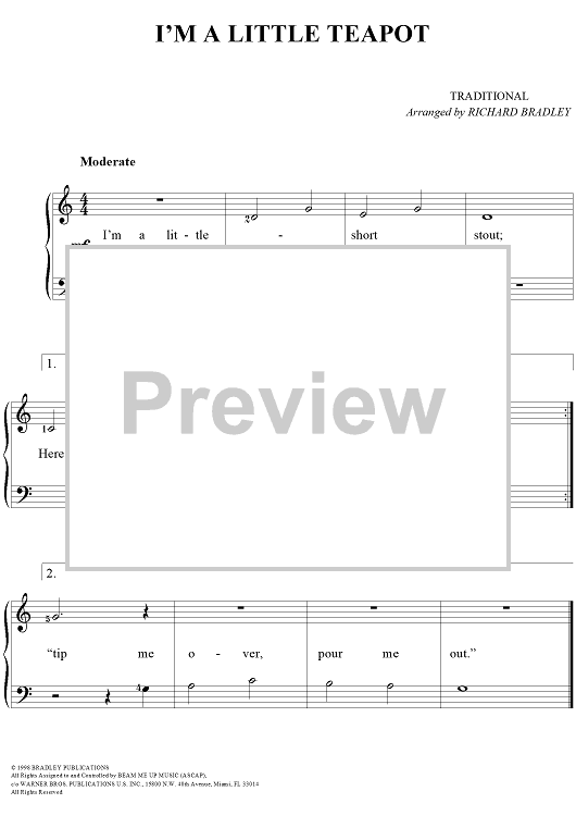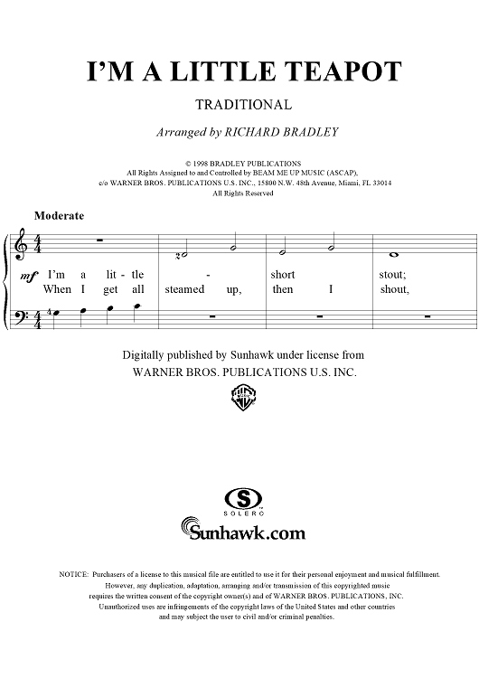 Digital Sheet Music for I'm A Little Teapot by Richard Bradley, Traditional scored for Five Finger Piano; id:118874