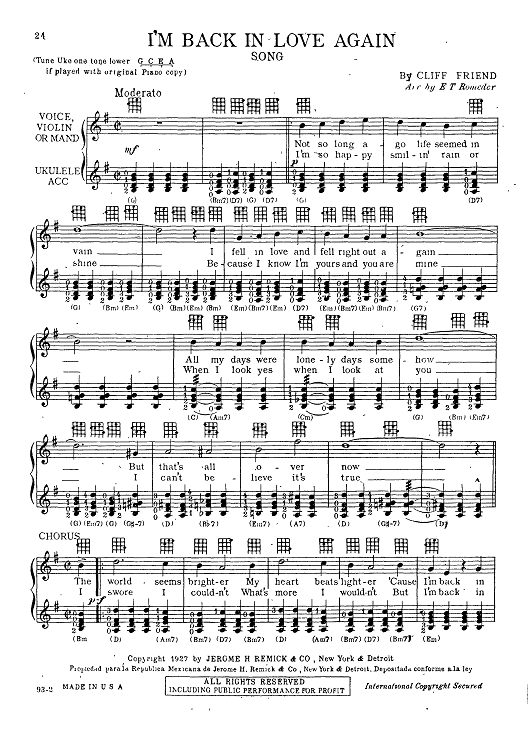 Digital Sheet Music for I'm Back In Love Again by , Cliff Friend, E. T. Romeder scored for Ukulele; id:418694
