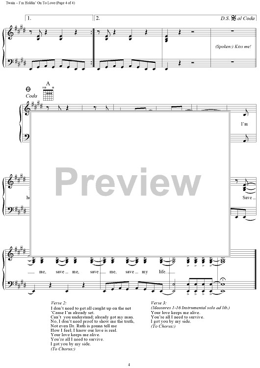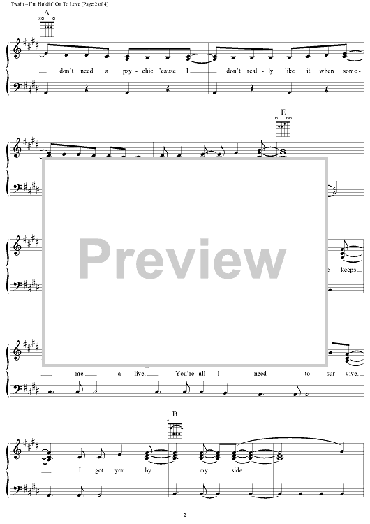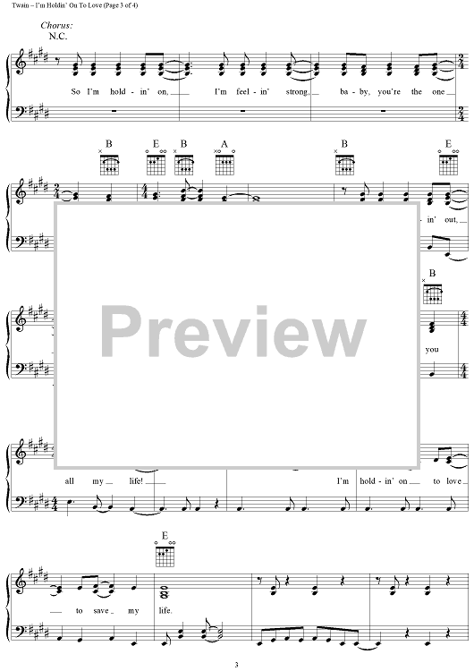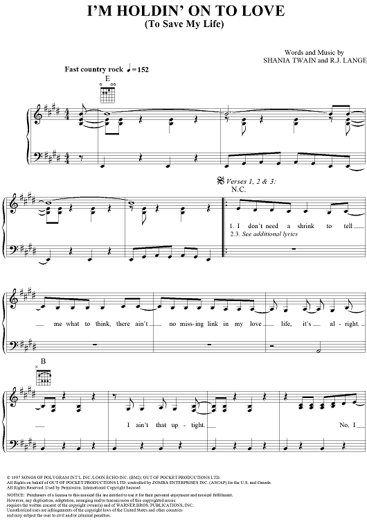 Digital Sheet Music for I'm Holdin' on to Love (To Save My Life) by Shania Twain, Robert Lange scored for Piano/Vocal/Chords; id:131743