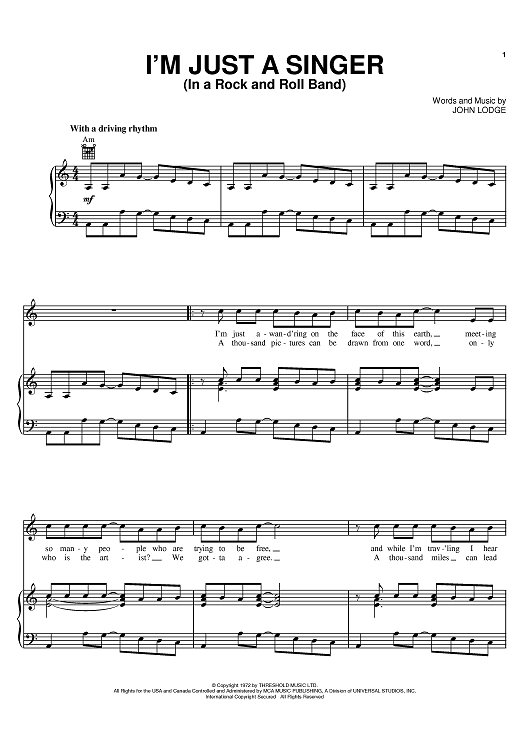 Digital Sheet Music for I'm Just A Singer (In A Rock And Roll Band) by John Lodge, Moody Blues scored for Piano/Vocal/Chords; id:382053