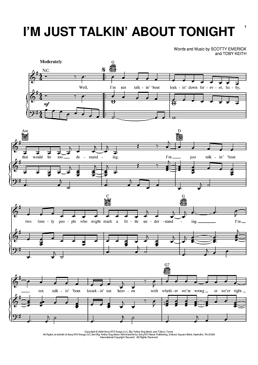 Digital Sheet Music for I'm Just Talkin' About Tonight by Scott Emerick, Toby Keith scored for Piano/Vocal/Chords; id:368575