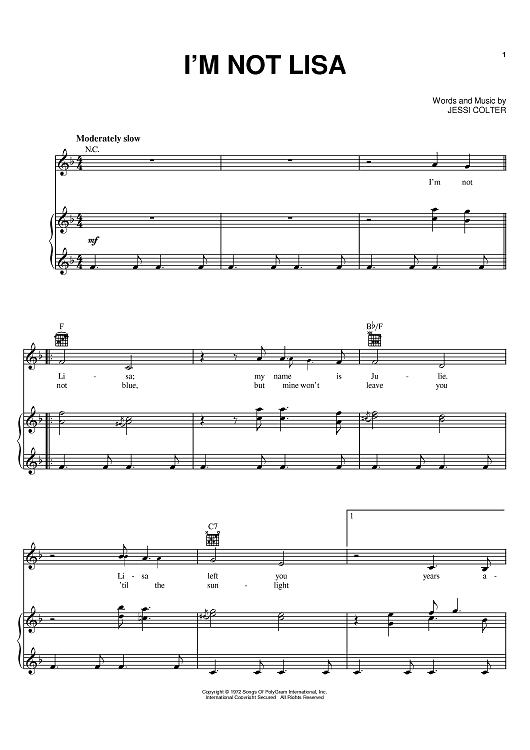 Digital Sheet Music for I'm Not Lisa by Jessi Colter, Marianne Faithfull scored for Piano/Vocal/Chords; id:382730