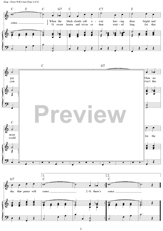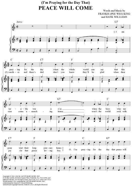 Digital Sheet Music for (I'm Praying for the Day That) Peace Will Come by Pee Wee King, Hank Williams scored for Piano/Vocal/Chords; id:263821