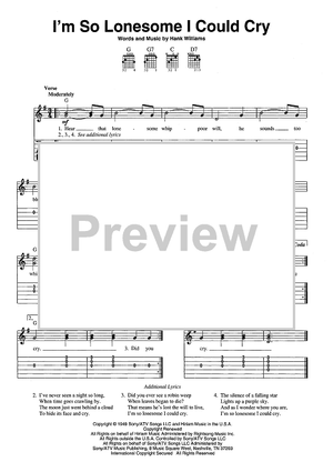 Digital Sheet Music for Im So Lonesome I Could Cry by Hank Williams scored for Easy Guitar Tab/Vocal; id:441438