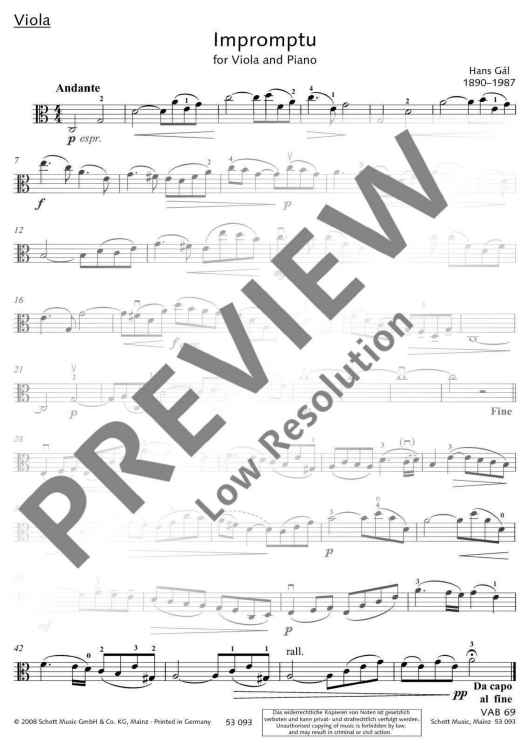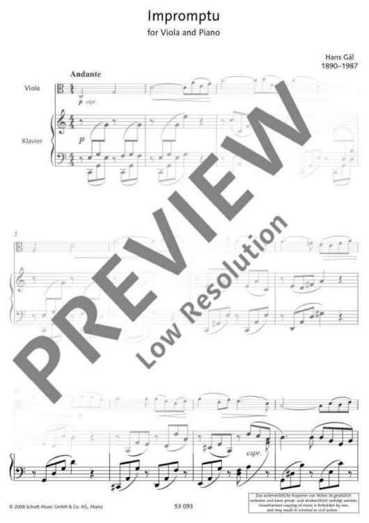 Hans Gál wrote 'Impromptu' in Edinburgh in August 1940 for his then 15-year-old son Peter. His son had already taken several violin lessons and now wanted to try to play the viola in order to join a youth orchestra. As a consequence, 'Impromptu' is easy to play, and its Romantic harmonies in the equally easy piano accompaniment make the piece a well sounding duo that can even be performed by beginners. The Austrian composer and musicologist Hans Gál (1890-1987) composed operas, orchestral works, concertos, vocal music and, especially in the last decades of his life, numerous chamber music works. In addition, he published books (Brahms, Schubert, Verdi) and essays. When Gál was forced to leave Germany in 1933, he first moved to Vienna and finally settled in Edinburgh where he composed and taught at the university until his death.