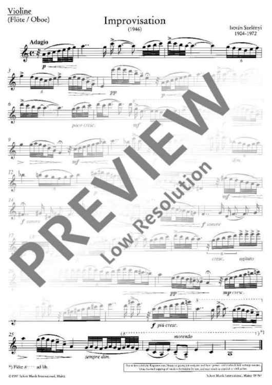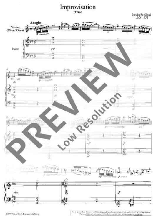 István Szelényi (1904-1972), a student of Kodály, taught composition at the Budapest conservatory. Apart from chamber music and piano pieces he composed mainly educational material, e.g. for youth orchestra and violin ensemble. Improvisation, composed 1946, is equally suited for violin, flute or oboe. Simple piano chords provide the background for a rhapsodic, improvisatory solo part with an eastern European folkloristic flavour.